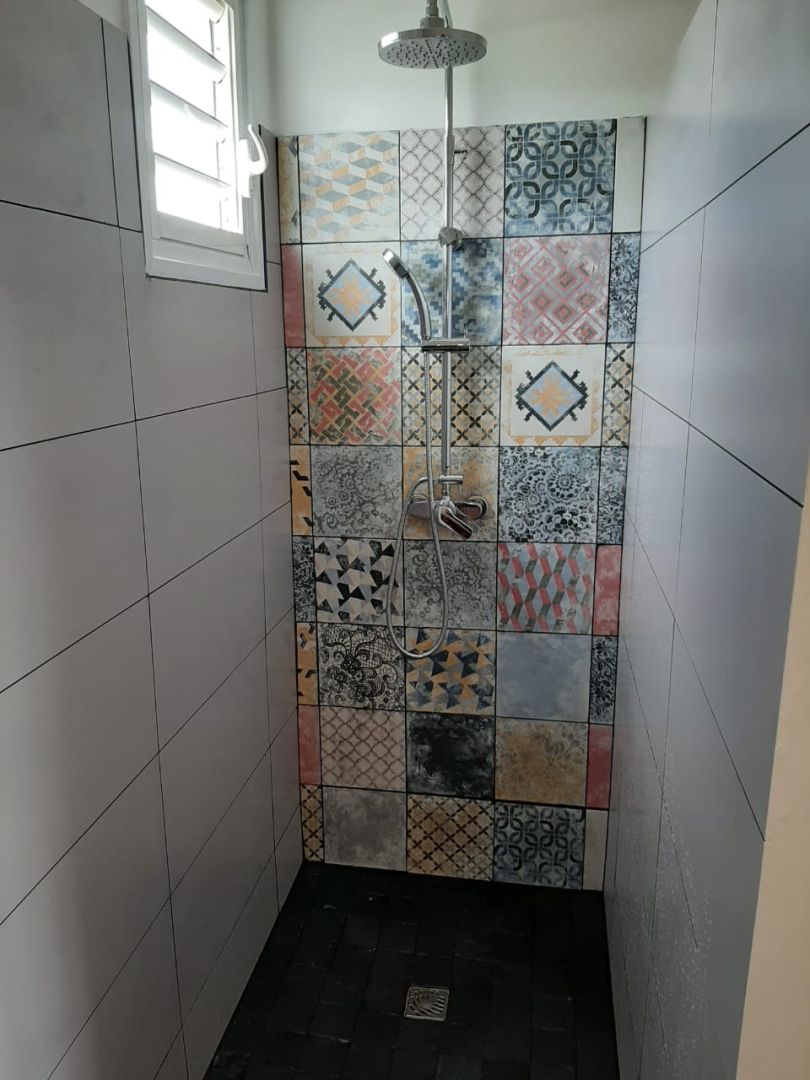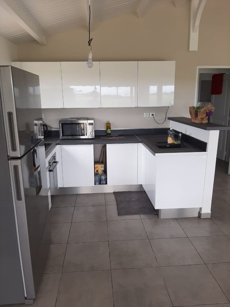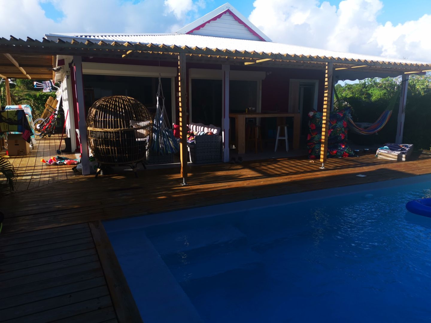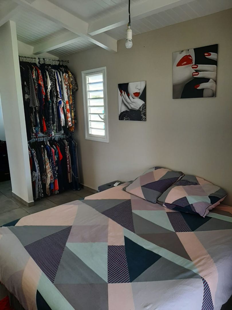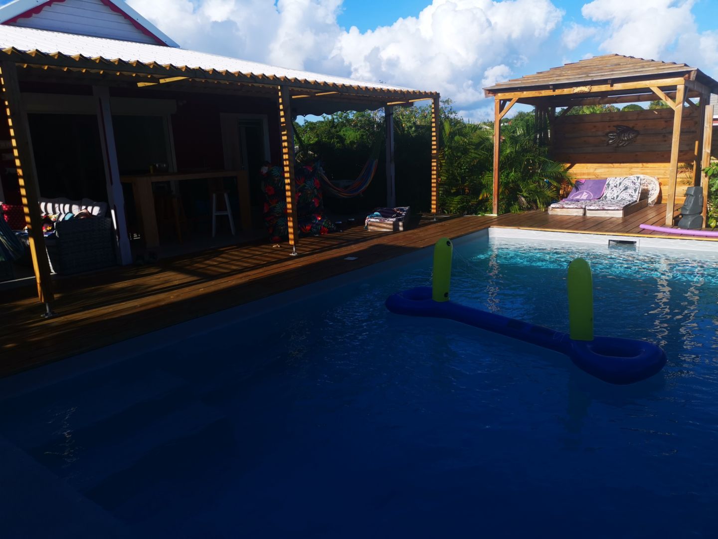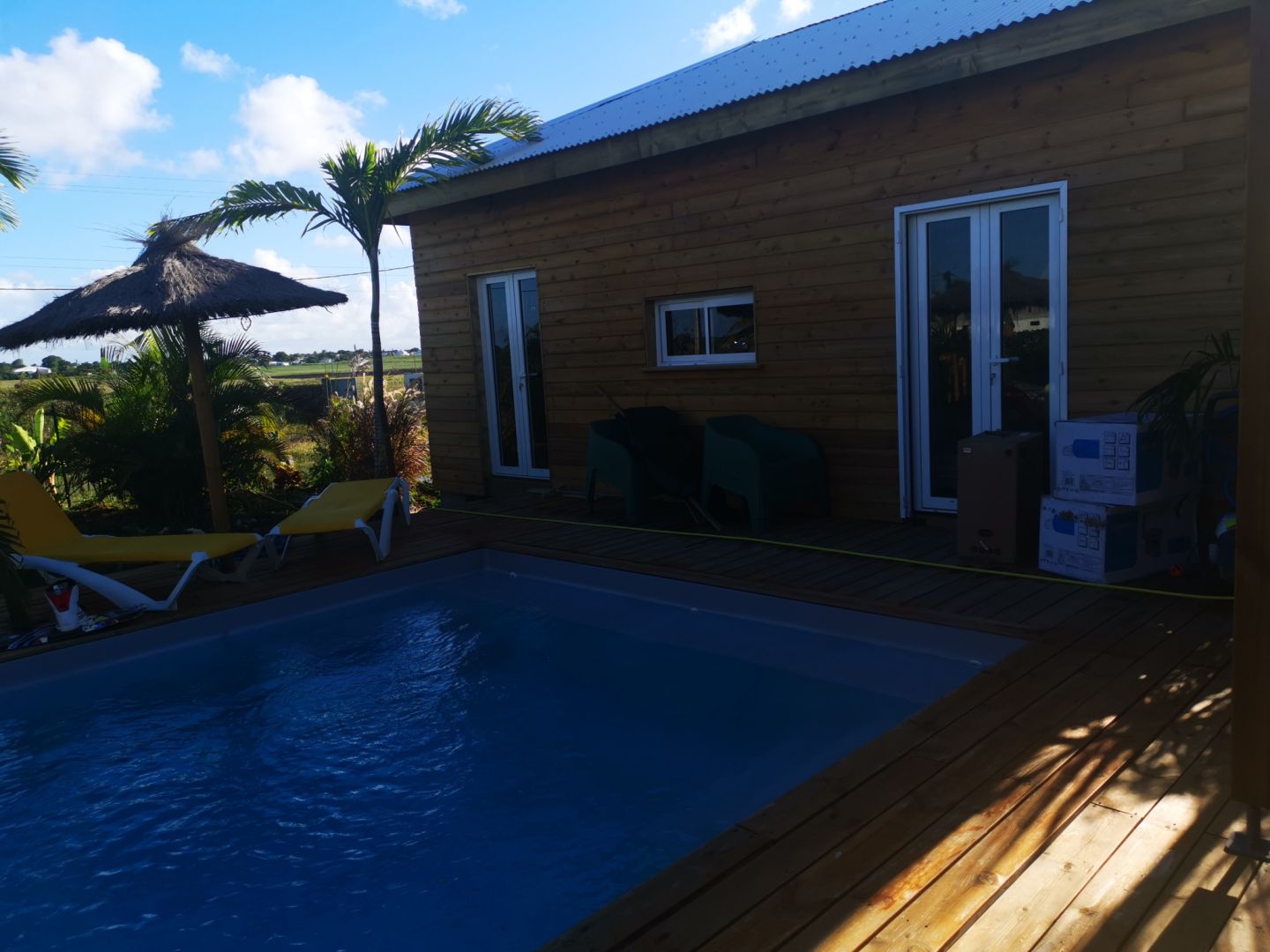 Jolie villa F4 neuve en bois composée de 1 chambre parentale + 1 dressing + sa salle d'eau privative + 1chambre -bureau, 1 salle d'eau, 1 WC indépendant. +2 chambres avec chacune sa salle d'eau privative-wc indépendante de la maison dont une des chambres avec dressing. Une cuisine équipée ouverte sur le séjour, grande terrasse couverte . Le terrain est de 1400m² clôturé avec portail électrique 1 bungalow pour 2 personnes avec piscine de détente garage cuve d'eau spacieuse piscine avec carbet de détente.